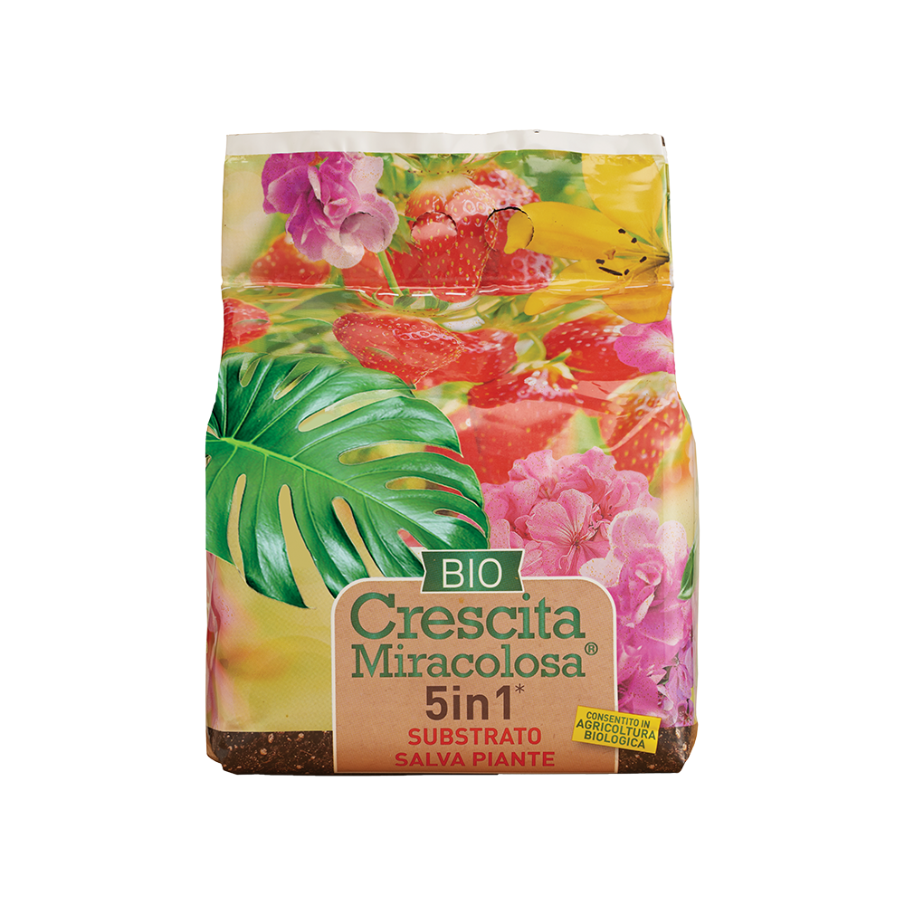 Miscelare il Substrato 5in1 Crescita Miracolosa con il terriccio in uso nella proporzione di 1 parte e 5 parti del terriccio scelto. Migliora le caratteristiche chimico-fisiche dell’intero ambiente di radicazione.